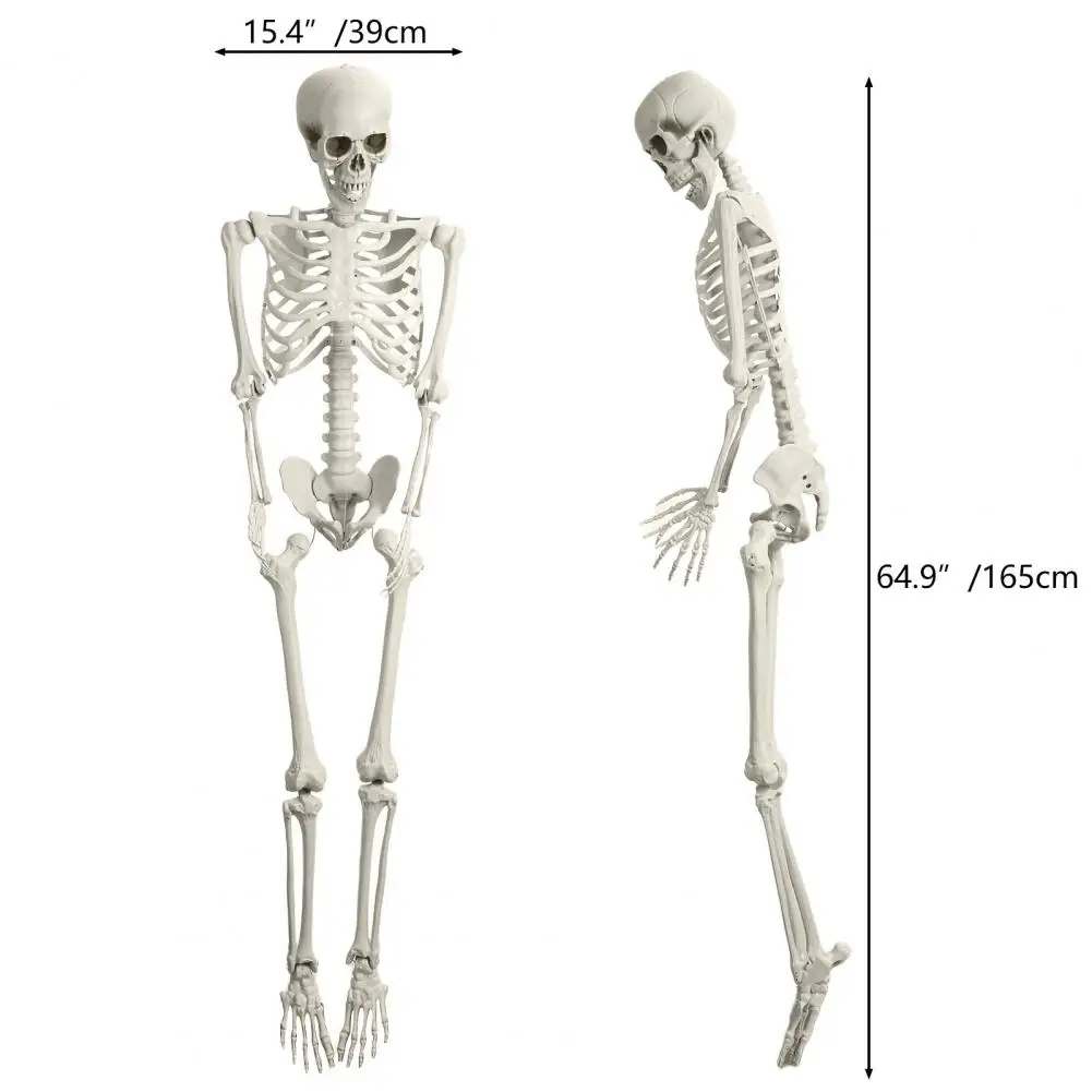 Creepy 5.4ft life-size poseable skeleton prop with movable joints. Perfect for haunted houses, Halloween parties, and spooky outdoor or indoor decorations. Durable plastic with realistic bone design.